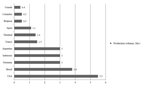 Production volumes of biofuels (bioethanol, biodiesel and biogas) by leading countries, 2018, bln. liters Source: Authors’ elaboration based on [28].