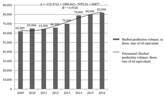 At present, the construction of new biofuel production plants with a total capacity of 6.6 million tonnes per year is already underway in China [13]. By 2020, according to the governmental decision, the whole country will switch to using motor fuel with the addition of bioethanol, which will require 15 million tonnes of biofuel annually [25,27]. Nowadays, in the field of production and sale of biofuels, China, unfortunately, is inferior to powerful Western competitors. This area of business is rapidly developing, as evidenced by the global growth trend in biofuel production, which is sold on world markets (see Figure 1 and Figure 2).