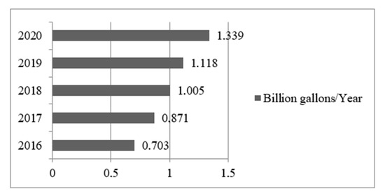 According to estimates by the Chinese government, the expected production of fuel ethanol will be about 4 million tonnes (1.339 billion gallons) per year during the 13th five-year plan. In 2017, ethanol production amounted to 2.6 million tonnes (0.871 billion gallons) per year, showing an increase of 0.5 million tonnes (0.167 billion gallons) per year if compared to 2.1 million tonnes (0.703 billion gallons) in 2016. In 2018, ethanol production increased to 3 million tonnes (1.005 billion gallons) per year. By the end of 2019, total ethanol production is projected at 3 million tonnes (1.005 billion gallons) [11,29]. In a consolidated form, the data are presented in Figure 3.