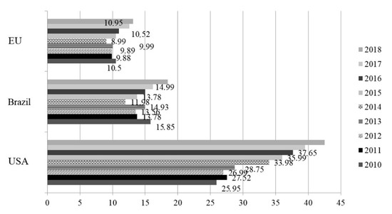 - Teixeira, M. Brazil Sets Sights on China’s Ethanol Market, But High Volumes Unlikely. Available online: https://www.reuters.com/article/us-brazil-ethanol-china/brazil-sets-sights-on-chinas-ethanol-market-but-high-volumes-unlikely-idUSKCN1VK0B6 (accessed on 22 September 2019).