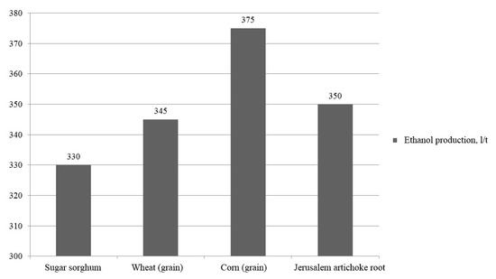 Ethanol production when using various types of biological raw materials. Source: authors’ elaboration based on [18,19].