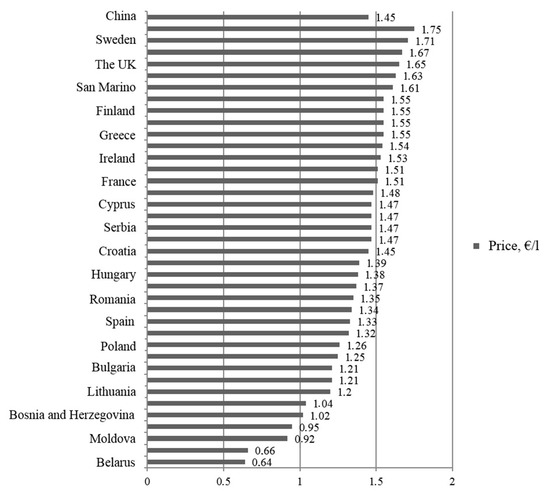 For comparison, the authors of the current study have used price lists of Chinese and European biofuel distribution companies [13,36,38,39]. As of the end of 2018, it was revealed that the maximum allowable price level at which bioethanol can be sold on European markets is 0.95 €/l, Figure 7.