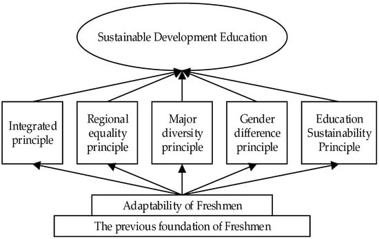 The integrated principle is the most basic principle in sustainable development education, mainly due to the current positioning of sustainable development education and the characteristics of the individual needs of students. Therefore, adhering to the integrated principle entails systematically considering the factors that influence the sustainable development education of university freshmen (personal emotions, learning, interpersonal relationships, university identity and living); it involves reorganizing, optimizing, and focusing on the influencing factors. It is necessary to maintain the existing overall teaching system and school education model; the review of education and its reconstruction for sustainable development are limited not only to the reduction of course content and adjustment of structural order, but also to the students’ own influencing factors [18]. Only by integrating the relationship between what the school provides and what students need can this paper implement sustainable development education in different types of schools and among different types of professional students by paying attention to students’ adaptive challenges. Education changes according to the all-round development of the student’s mind and body, according to which educational content, educational methods, organizational strategies, and evaluation criteria can be properly adjusted [6].