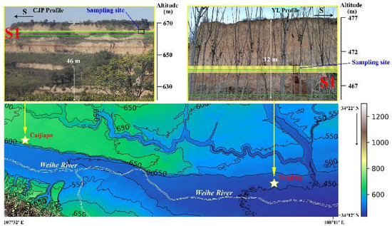 Terrain map (lower) and the overall landscapes of the two study profiles (upper). The green frames in the upper two photos showed the first paleosol layer (S1), and the two light yellow bands on the green frames show the study segment corresponding to Figure 3.