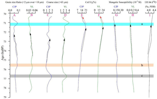 The content of calcium carbonate (CaCO3) and MS for the two profiles are also shown in Figure 4. CaCO3 is a meaningful constituent of the loess-paleosol sequence on CLP, and its content as well as the formation of calcium silicate, are closely related to the climatic evolution [43]. However, in the CJP and YL profile, the CaCO3 curves almost increased smoothly from 4% to 20% and thereafter remained roughly at the high level of 12–24% (curves E and F). There was hardly any fluctuation before 72 ka B.P., and the overall trend was very similar to that of SPECMAP. Thus, no climatic events could be extracted from the section of 78–72 ka B.P. in curves E and F. In addition, an oscillation appeared (blue band an in Figure 4) at 71.6–70.5 ka B.P., and the CaCO3 content decreased from 20.1% to 12.7%, indicating the increasing trend in precipitation during the cooling trend, however, this oscillation was not identified in the MS curves.