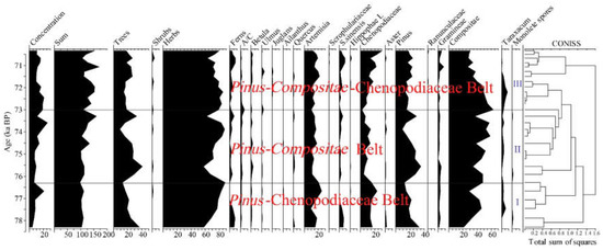 PZ-Ⅱ (76.3–73.0 ka B.P.) is dominated mostly by Compositae pollen in both profiles. Artemisia, Chenopodiaceae and Pinus are also abundant. Pollen concentration is lower than PZ-I. The lower sub-zone reveals that the paleoclimate became cooler and drier, and some plants migrated or disappeared. Herbs and pines dominated the area. Wet habitats with Taraxacum, Betula and Ulmus rarely grew here. Hippophae L increased at both profiles. According to the modern analogue methods, these pollen assemblages reflect sub-glacial environmental conditions with a slight deterioration in the middle sub-zone.