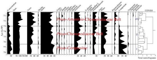 Since the fossil pollen record has been widely accepted as a method for reconstructing the paleo-vegetation [34,46,47], and in the CLP, the surface pollen assemblages could faithfully represent the modern vegetation [48]. It was reliable to analyze the paleo-vegetation of the study area by means of pollen assemblages. The studied pollen spectra can be subdivided into three pollen zones (PZ) (Figure 5 and Figure 6) as follows: