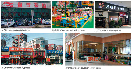 Recently, the daily behavior pattern of Chinese children has changed significantly. Children’s sedentary behavior has increased, and the frequency of outdoor and physical activities has decreased. In China, parents consider a child’s academic performance to be the most important activity. Therefore, children spend more time on homework and off-school cultural activities (reading, writing, drawing, etc.) [69]. Art activities and tutoring activities have become part of the daily lives of most urban children. Children’s outdoor activities and group activities have also greatly reduced, which limits social development of children to a great extent. At the same time, the commercial operation of children’s activity places has greatly improved the level of fine service of places. Commercial activity places have better presentation and richer environmental facilities, which appeal to children and have changed children’s interests and activities.