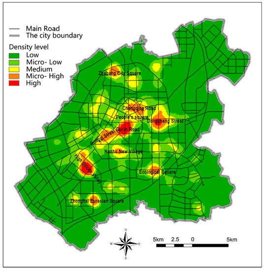 Kernel density estimation is a common research method in geography. It is used to identify the gathering area of children’s activity places and analyze the degree of concentration of children’s activity places in the surrounding areas [61]. In this paper, the density estimation was used to analyze the spatial distribution pattern of children’s commercial activity space in Changchun. The kernel density estimation uses a nonparametric method to calculate the probability density of random variables [62]. It estimates the aggregation degree of spatial point features distribution by a regular moving quadrat [63]. The formula used was: