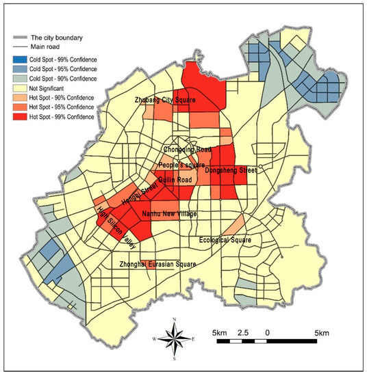 The identified areas of medium-high density hotspots were used to extract the area, number of POIs, and the average kernel density of each hotspot. Using the group analysis tool in GIS, the space constraint parameter, NO_SPATIAL_CONSTRAINT, was selected. The nine hotspots identified were clustered and divided into two levels, i.e., municipal center and district center, for children’s activity places (Table 2).
