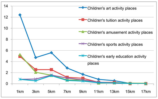 In this paper, the point density of children’s activity places in each circle was used to represent the spatial distribution characteristics of the “center–periphery” of children’s activity places (Figure 5). In general, children’s activity places were mainly distributed within an 11 km circle with Changchun People’s Square as the core. The spatial differentiation of “center–periphery” of various children’s activity places showed that: (1) The distribution range of children’s art activity was the widest and the density was highest in the central area and formed a secondary peak at 5 km with a downward decreasing trend. (2) The circular trend of the distribution of children’s tuition activity places and children’s amusement activity places was similar; the circular distribution density gradually decreased from the center to the periphery. (3) The circular distribution of children’s sports activity places and children’s early education activity places showed an “inverted u-shaped trend”, with the circle distribution density reaching a peak at 5 km which decreased successively outward, mainly within 3–9 km.