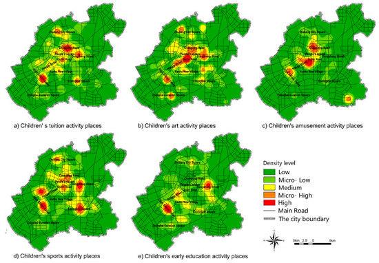 There were significant differences in the spatial distribution of children’s activity places for different categories. The high-density hotspots of children’s tuition activity places, children’s art activity places and children’s amusement activity places were mainly distributed in the urban core area, and the kernel density decreased in a step-like manner from the urban center to the periphery. However, the high-density hotspots of children’s sports activity places and children’s early education activity places were mainly distributed in the urban periphery, forming a spatial distribution pattern of “low-core–high-periphery”. The space diffusion characteristics of children’s tuition activity places, children’s art activity places, and children’s sports activity places were the most significant, forming a cluster center of multiple levels within the urban center. The number of high-level, medium-level, and low-level cluster centers increased successively, and the spaces crisscrossed with a wide range of services. However, the space agglomeration characteristics of children’s amusement activity places and children’s early education activity places were more significant. The number and scale of 2–3 primary centers, secondary centers, and tertiary centers were very low and they had not yet developed. The spatial diffusion characteristics were not significant and the service scope was small.