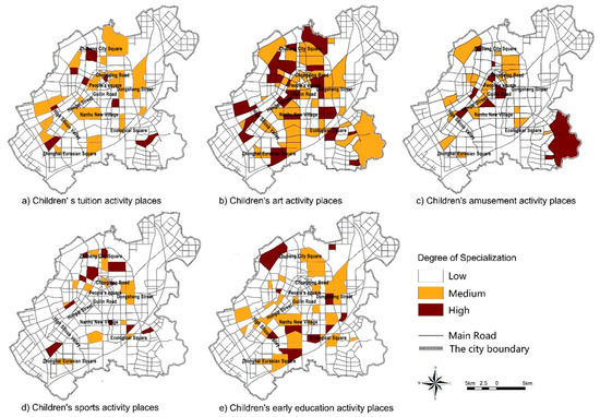 From the perspective of the specialization of children’s commercial activity places, children’s art activity places are numerous and are widely distributed with highly specialized blocks. The highly specialized blocks of children’s amusement activity places are concentrated in the city center and are closely integrated with parks and large commercial facilities. The highly specialized places with blocks of children’s tuition activity, children’s sports activity, and children’s early education activity are out of place with their high-density hotspots. The highly specialized blocks of these three kinds of activity places are mainly distributed in the urban periphery, indicating that their competitive advantages in the urban center are not obvious.