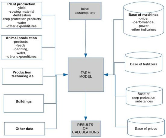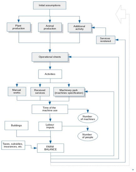 Modelling consists of simplification of complex facilities and phenomena that take place in a real world to obtain a clear model which may be used for desired purposes (e.g., optimisation) [40,41]. An agricultural farm is a specific facility that may carry out varied production. The fact that modelling is related to biological facilities in combination with the random character of phenomena that take place in the environment causes that the farm model may be more complex than the model of the production enterprise. Additional impediment results from relations between the production departments, division of production resources and a great variability of farms (various cultivated plants, animal groups, production technologies, etc.,). As a result, although the general formula is quite simple, calculation of each of elements may be a complex process.