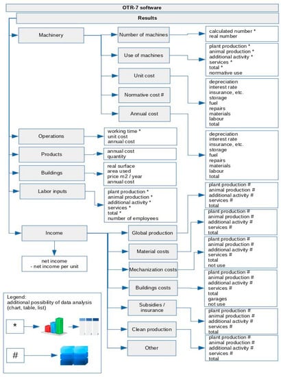 It is assumed that the developed application has not only to enable calculation of the minimal required number of machines but also enable calculation of costs of their exploitation, expenditures of human work and calculation of a thermal balance of the entire farm and a detailed analysis of the results of calculations. The designed production technologies (operational sheets) enable estimation of the annual use of machines and this combined with the parameters of machines (such as e.g., price of a machine, unit fuel consumption, exploitation period of a machine etc.,) enables calculation of particular elements of their costs. Collection of information on the performed production in the data base of OTR-7 program in combination with the calculated costs of mechanization enable calculation of the thermal balance of a farm according to the following Equation (1):