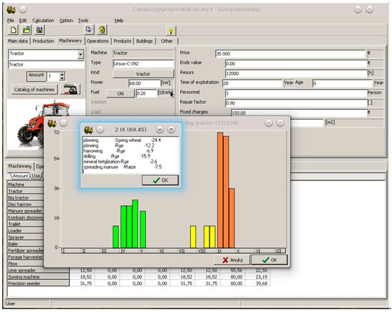 Since, in modern programming methods, the program operates by events handling (e.g., clicking of any button), making the calculations algorithm does not require filling of subsequent dialogue fields (solution along with the following filling of fields is often used in non-complex programs and internet applications). As a result, the order of data introduction is free. However, it is recommended to fill the fields and bookmarks with the order resulting from the applied design method. The person that designs the farm may return to the previous data and correct them any time. An exemplary screenshot (Figure 4) presents a data card of the selected machine (a big tractor)—an upper part of the program window and below the calculated use of machines along with the graph of the machine use within one year (a tractor) as well as the window with a list of treatments performed during a selected period (2nd decade of September).