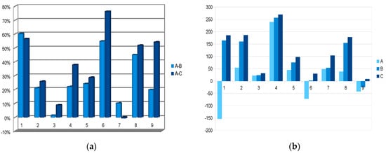 Results of simulation of the selected farms: (a) Percentage reduction of the costs of exploitation of machines (comparison of version A and B and A and C); (b) income of a farm in thousand PLN in particular versions of the project.