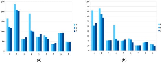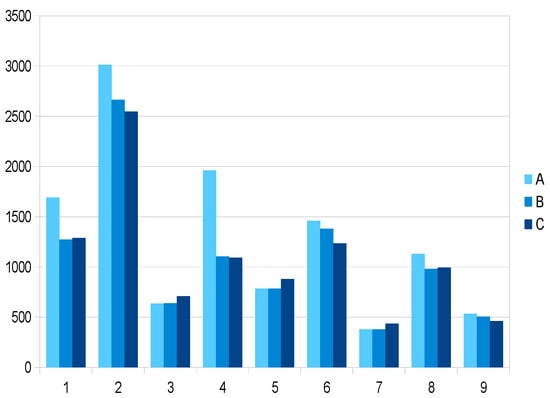 Exemplary results of simulation made on nine objects are presented in Figure 5, Figure 6 and Figure 7. Simulations were made for agricultural farms with a varied surface area. Farms were characterised with a varied structure of sowing. As a result, equipment with farm tractors and machines also differed. The surface area of the analysed objects was respectively 150 ha in model 1; 120 ha in model 2; 90 ha in model 3; 60 ha in model 4 and 30 ha in models 5–9. The presented results of analyses concern three versions of the farm project. Each subsequent version of the project is better than the previous one. The diagram also shows a percentage decrease of the mechanization costs in further versions (a change from version A to B and from version A to C) and the income of a farm (in thousand PLN). The base project (version A) not always was profitable. In some cases, a positive balance could not have been achieved with the use of only own machines (version B). Introduction of possibilities of rendering mechanization services included in version C. In case of students’ machine sets were designed in such a manner. One may notice, a considerable divergence of the calculated indexes in farms with the same surface area (30 ha—models from 5 to 9), which is confirmed by the fact that amount of the income is determined only by the farm area. The manner of managing the farm mainly influences the effects of farming.
