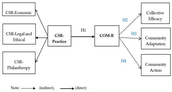 Gibson and Klinck [46] stated the need for the market to drive the existence of industry and the development in various supporting sectors with a huge effect. The society must negotiate the ways these changes occur, such that society can understand, adapt, and influence. Thus, increasing research on the indicators of endurance and well-being are valuable tools to support key elements and track how benefits and effects are distributed. Buikstra et al. [47] reported that community development and social impact assessments offer insights into the quality and assets of communities that enable them to adapt to major changes or grow successfully. Individual and COM-R components are identified as social networks and support (e.g., learning, positive outlook, environment and lifestyle, initial experience, sense of purpose, infrastructure and support services, differences, innovative and diverse economies, confidence and management) experience changes. These components require interaction among people, infrastructures, communities, the economy, and the environment in the process of building resilience. Rudito [48] stated that the practice of CSR using community development directs a positive change in the sustainability and economic aspects and an effect of CWB [49] and increases COM-R [20,44]. Thus, previous research has shown that direct CSR practices contribute to COM-R. The first hypothesis was expressed on the basis of these findings.