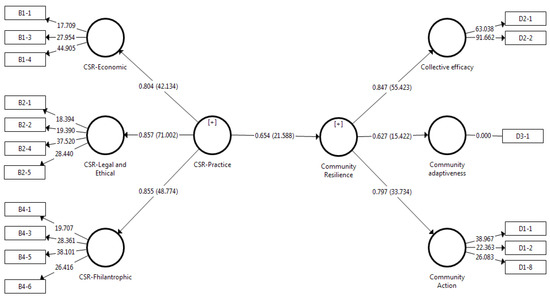 We adopted previous researchers’ validated and established measurement items using the same variables. A five-point Likert scale was used to measure CSR and COM-R dimensions. We adopted the CSR measurement from the pyramid of Carroll [61,92] and other researchers (Maignan and Ferell [93]; Perez et al. [94]; Stanaland et al. [95]; Serageldin and Steer [96]). Table 4 shows the CSR dimensions. Walton et al. [22], Magis [44], and Iskandar et al. [49] established the COM-R scale. COM-R has three dimensions as follows. (1) Community actions pertain to respondents considering how their local community responds to CSR practice and nickel mining activities regarding planning, accessing relevant information, having adequate leadership, supporting volunteers, establishing key networks within the community, demonstrating good working relationships between intergroup, preservation, and an overall assessment of how satisfied they are with the manner in which the community responds to change. (2) Community efficacy represents respondents considering how well residents, businesses, governments, and company’s resources can work cooperatively to address concerns or take opportunities in relation to CSR practice and nickel mining activities. (3) The level of community adaptation is when respondents are asked about their perception of the manner in which the community handles CSR practice and nickel mining activities. Table 4 presents the indicators that measure COM-R. We used a 5-point Likert scale, from 1 = strongly disagree to 5 = strongly agree for constructs measurement [97]. The survey questionnaire was tested for internal reliability on 76 family leaders and found that the Cronbach’s alpha (CA) (α) for CSR was 0.90, classified as excellent, and COM-R was 0.77 indicating acceptable internal consistency [98,99,100]. With PLS-SEM analysis (Hair et al. [100]), the composite reliability for CSR constructs between 0.81 and 0.83 and COM-R constructs between 0.81 and 0.82 was considered good [98].