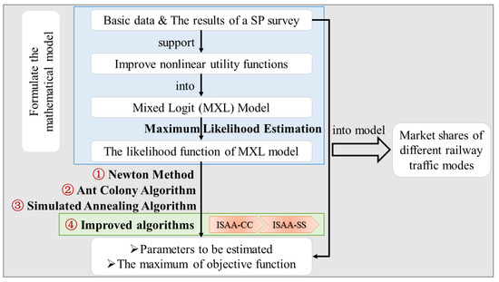 To characterize this problem in a mathematical way, in this section, we will explicitly discuss the formulation process for a mathematical model about solving market shares of different railway traffic modes, namely mixed logit model based on improved nonlinear utility functions. The technical route of the specific research in this paper is shown in Figure 1.