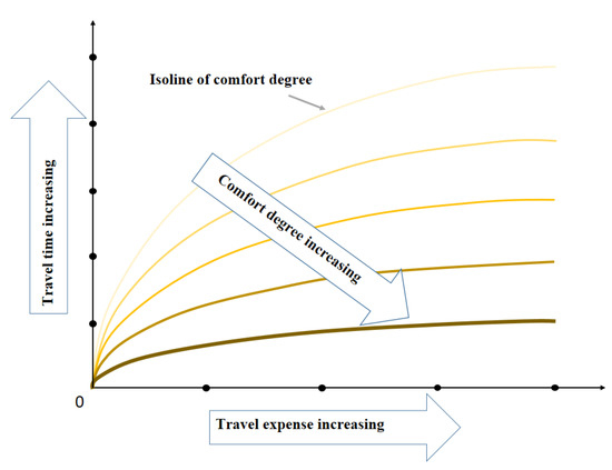 (c) Comfort is including the space, service and environment of railway traffic modes, which are measured by fatigue recovery time of passengers and different grades of train seats (reflected by the change of ticket prices). Therefore, the comfort degree is inversely proportional to travel time and proportional to travel expense, as shown in Figure 2 below.