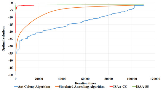 It can be concluded from the above table that ISAA-CC proposed in this paper has the shortest running time and the optimal final objective function value. ISAA-SS proposed in this paper is second to ISAA-CC about the optimum solutions but also is second to the simulated annealing algorithm about the running time.