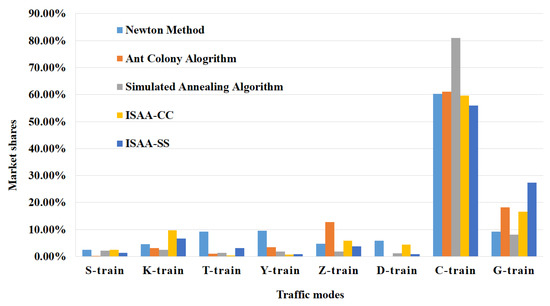 The results, i.e., market shares of different railway traffic modes, calculated by these five algorithms, are shown in Figure 9.