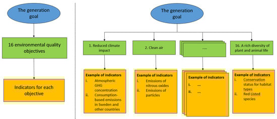 Illustration of (left) the framework for the Swedish Environmental Objectives and (right) examples of objectives and indicators (based on Sveriges miljömål [17]).