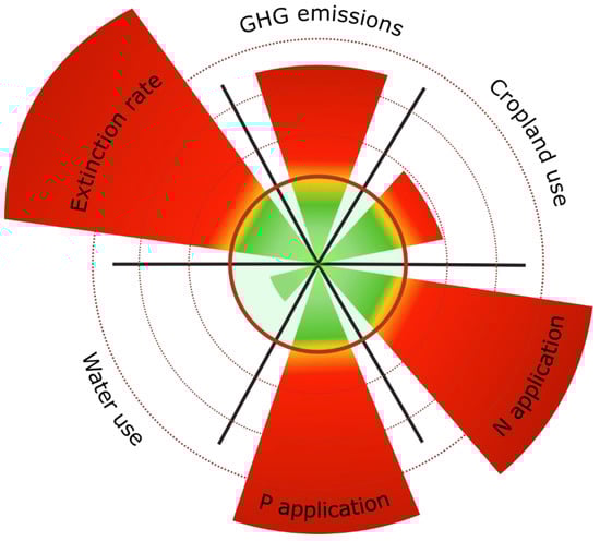 To reduce these environmental burdens, profound changes in the food system are needed, including a shift towards environmentally sustainable diets [1]. These are often regarded as diets causing lower environmental impacts (e.g., [5]), which several studies have identified as diets with a low to moderate amount of meat and animal-based products and a larger share of plant-based foods than in current diets in many high-income countries [6,7,8,9]. This conclusion was also reached by Martin and Brandão [10], who investigated implications of dietary changes by the Swedish population. The average Swedish diet involves high intake of meat and dairy products in comparison with both the European and global average [11,12], and Martin and Brandão [10] demonstrated that switching to a vegetarian or vegan diet could decrease several environmental burdens. However, although such results give valuable insights into the relative performance of diets, they do not show whether the diets are sustainable ‘enough’ to reach environmental targets. For this, it is necessary to evaluate the environmental performance of the diets relative to absolute thresholds, beyond which they can be considered unsustainable. Such thresholds are highly challenging to establish, but some attempts have been made. One example is the ‘One Planet Plate’ concept, where the World Wildlife Fund (WWF) in Sweden sets absolute limits for GHG emissions from yearly consumption of food [13]. Another example is given by Röös et al. [14], who investigated the environmental sustainability of the average Swedish diet by defining per capita thresholds for GHG emissions and occupation of agricultural land for Swedish food consumption, and then benchmarking the impacts of the diet against these boundaries. Furthermore, the EAT-Lancet Commission [1] recently proposed absolute boundaries for six Earth system processes, within which the global food system should operate to be environmentally sustainable.