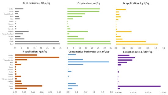 The highest impact on the climate and several other environmental categories per kg of food was found for ruminant meat, i.e., beef and lamb (Figure 3), which is in line with earlier findings [7,48]. This led to important contributions to the impacts of the average diet for all variables, but were especially pronounced for GHG emissions, cropland use and nitrogen application (Figure 4). Pork, chicken, processed meat products and dairy products such as cheese also had high environmental impacts per kg (Figure 3) and made a high contribution to all impacts (Figure 4). The impacts of fish and seafood varied depending on fish species (Supplementary Material), but the relative contribution to the overall impacts was generally low compared with that of other animal products (Figure 4).