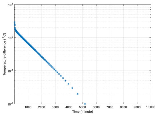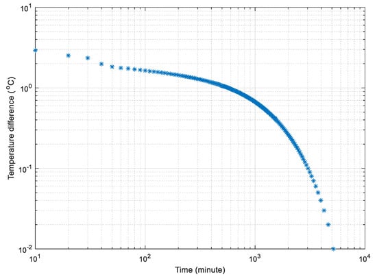 For the application, one of the rooms in a building was heated up to a high temperature and then the heating source was stopped. Starting from the stop time, the records of temperature were taken at a set of predetermined time durations. Logically, the decrease in the temperature by time appears in Figure 4 as similar to Figure 2, where the temperature decrease appears in a decreasing form, which reflects the actual time–temperature variation situation in the room after the turning off the heating source. It has to be remembered that the test conditions require homogeneity, isotropic uniformity and room air without any ventilation. These conditions should be available at experimental room in this case its dimensions are: floor area equal to 3 × 5 = 15 m2; room height equal to 2.9 m; room volume as 3 × 5 × 2.9 = 43.3 m3. The U-value for the concrete room is 2.296 W/m2K.