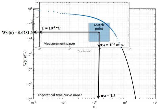 The standard curve in Figure 1 was overlain on the same double-scale recorded time–temperature scatter diagram, and they were shifted on each other such that the corresponding axes are always parallel to each other until the best match was obtained between the theoretical standard curve and the data scatter points, which led to Figure 6. For the numerical solution, a match point was selected on the common area of the two graphs, which is shown by M (match point) in Figure 6. The next step is to read from this figure two theoretical standard curve values, namely WM(u) = 0.0281 and, on the horizontal axis, uM = 1.3. The corresponding values on the data sheet axes are T = 10−1 °C and matching time, tM = 103 min. The substitution of these values into Equations (19) and (20), respectively, yields the storativity and heat conductivity coefficients.