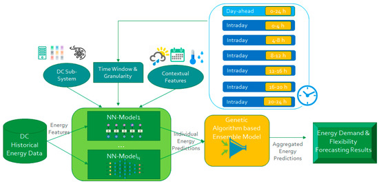 Few state-of-the-art approaches address the topic of DC energy forecasting for DR participation, most of them being focused on energy demand and none, to our knowledge, addresses the forecasting of energy flexibility. Dayarathna et al. [17] conducted a survey of techniques for DCs energy consumption modelling and energy demand forecasting. Besides identifying the IT equipment and facility infrastructure as the main consumers they classified existing machine learning-based approaches for DC energy consumption forecasting. They concluded that existing research work concentrated more on studying the energy efficiency of lower hardware levels of DCs, but less on higher aggregated levels which is desired for DR programs. Google’s researchers [18] have trained a generic three-layered neural network on DCs to predict the power usage effectiveness (PUE) ratio, showing that prediction methods could be an effective way to model DCs performance that could bring significant cost savings on the global energy market. They achieved a 40% reduction in the amount of energy used for cooling their DC. Several DC energy prediction models are proposed, most of them targeting the increase of energy efficiency of DC operation [19,20] in isolation, without considering smart energy grid integration. Similarly, multi-objective genetic algorithms can be used to dynamically forecast resource usage and energy consumption in DCs [19]. They can forecast the resource requirements for a future time slot according to the historical data in previous time slots which is fed as input for virtual machines placement algorithms having as general objective the decrease of DC energy consumption. In [20] the authors present a DC power prediction framework based on power profiling and deep learning models. For short-time forecasting, a recursive autoencoder is used onto fine-grained models while for long-term prediction massive fine-grained historical data are encoded into the coarse-grained model. According to [21] the intermittent nature of renewable energy sources is seen as a major drawback of using it on DCs site. The authors propose a scheduler that uses IT and electrical models of the DC energy consumption together with an energy availability prediction engine for the next 48 h. In [22] a multi-layered ANN is defined and used to forecast the DC energy consumption on monthly intervals based on the historical energy consumption data. The forecast engine is implemented using MLP. Considering stability over prediction accuracy, in [23] a forecasting model that uses dynamic adaptive entropy-based weighting for total energy demand forecasting is proposed. The model combines classic prediction techniques such as Holt-Winters Multiplicative algorithm and moving average, using a weighted based ensemble. Finally, in one of our previous works [24] we proposed and successfully used neural network prediction models to forecast the DC server room temperature which is then used as input into the thermodynamics processes simulations to decide on adapting DC thermal energy profile for providing on-demand heat to nearby neighborhoods.