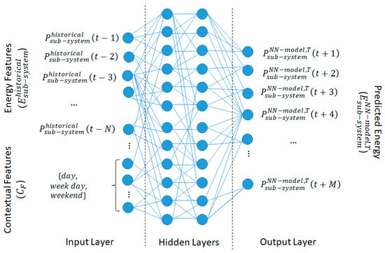 Each individual neural network is generically modeled as a set of neurons distributed over several hidden layers trying to map the energy inputs to outputs through a non-linear function (see Figure 4). Each model is then configured according to the forecasting time window, being fed with number of historical energy data inputs and additionally with the contextual features , and will predict number of future energy values.