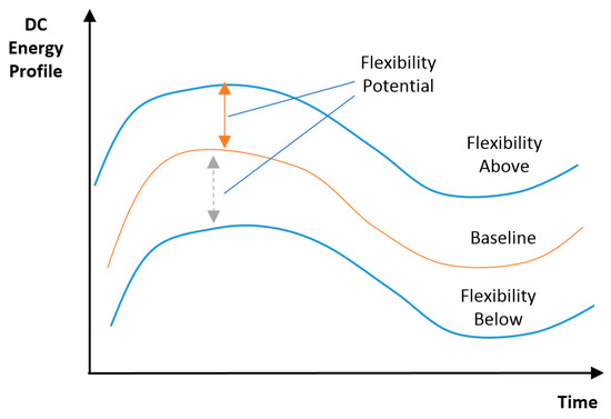 The flexibility above and below profiles as well as the baseline for a DC sub-system over a period of 24 h is illustrated in Figure 6. The difference between the above profile and baseline as well as the difference between the baseline and below profile provide the energy features for the machine learning algorithms used to forecast the energy flexibility of each DC sub-system.