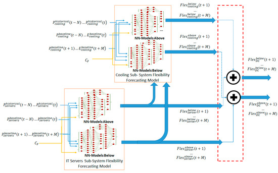 The flexibility forecasting aims to determine the demand flexibility of each DC sub-system over future timestamps at granularity based on a set of historical values of the considered features. The main sources of energy demand flexibility in a DC are the IT servers and cooling sub-systems. We have considered which other components that may deliver certain flexibility levels such as the auxiliary energy storage devices - are included in the flexibility profiles of the above-mentioned sub-systems. Following the energy relation between the DC sub-systems (see Figure 7) the cooling system flexibility forecasting model has the output generated by the server room flexibility forecasting model as input. Each individual sub-system flexibility model has the historical monitored energy consumption values, the baseline values over the previous time steps and the estimated baseline for the next time steps as inputs while their outputs are aggregated to compute the total DC energy demand flexibility.