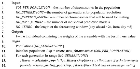 The pseudocode for the evolutionary optimized ensemble is presented in Figure 8. Each chromosome in the genetic algorithm has several genes corresponding to the length of forecasting time window (number of timestamps considered): 24 in the case of day-ahead, and 8 in the case of intra-day. Initially the individuals are randomly created by generating a random weight vector (line 11) for each gene corresponding to the timestamp .