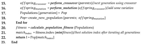 Then, for each new generation the fitness function is computed for all individuals in the population (lines 12–13). The individuals with the best fitness value are selected as parents and mates for the next population generation (line 14). Using the crossover operation, the new individual offspring is calculated having its first half of genes taken from the first parent and the second half from the second parent ( being defined at the center):