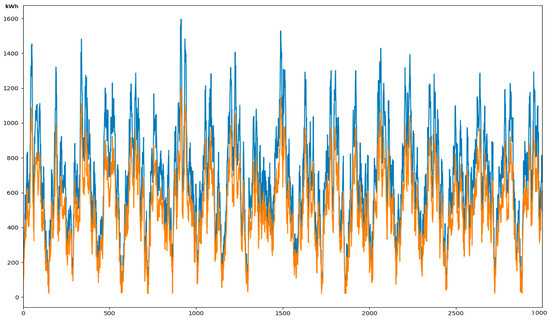 Electrical energy historical data used in forecasting (orange—cooling sub-system & blue—IT servers’ sub-system).