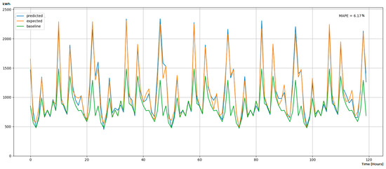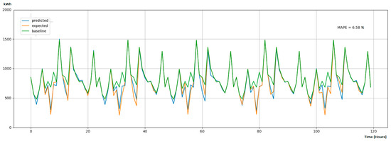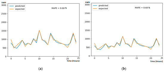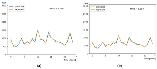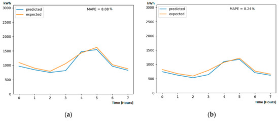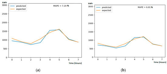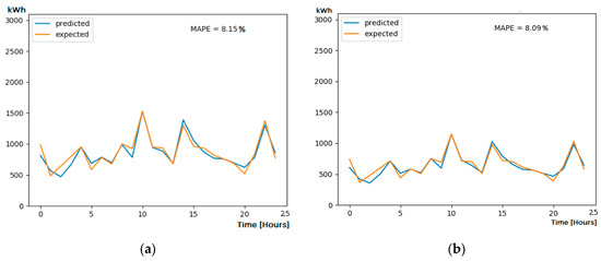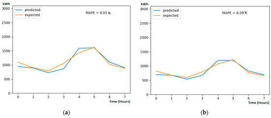 Figure 10 and Figure 11 present details on the best forecasting results (i.e., best day from the testing set) obtained in terms of predicted energy profile compared with the actual one for different configurations of the forecasting models. The MAPE values for both type of weak learners considered are above 8% (i.e., 8.68% for MLP and 8.50% for LSTM).