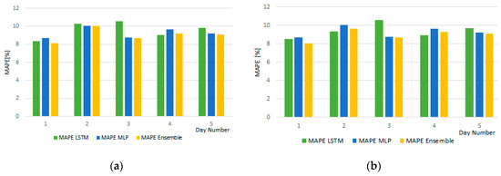 Figure 13 shows the average MAPE obtained by the two individual prediction models LSTM and MLP as well as the ensemble model over the entire testing period for the day-ahead time frame. The LSTM models MAPE average is 9.50%, MLP achieves a MAPE of 9.276%, while the ensemble models achieve a MAPE of 9%. As it can be seen in the chart, on some days the LSTM works better, while on others the MLP models predict with better accuracy. On the second test day, the ensemble model achieves a MAPE of 8.15%, best result obtained by any of the three models.
