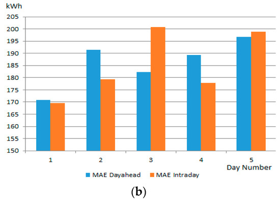 Day-ahead and intra-day energy demand prediction results vs. actual monitored values ((a)—detailed results day number 4, (b)—MAE distribution on 5 days of testing data).