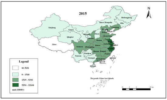 Using Equations (1)–(3), we calculated the carbon emissions in the construction industry. Figure 1 shows the distributions of carbon emission in 2005 and 2015, which employed the natural breaks method with ArcGIS to rank the carbon emissions of different regions. Compared to the carbon emissions in 2005, the carbon emissions in 2015 have grown dramatically, with the highest value increased from 4664 × 104 t in 2005 to 12,644 × 104 t in 2015. Figure 1 also shows that Shanghai, Jiangsu, and Zhejiang were always the largest emitters, while the other coastal regions and the middle regions in China emitted moderately. Western regions often had the lowest levels of carbon emissions. Such distribution of carbon emissions in different regions is generally consistent with the regional characteristics. For example, the level of economic growth, population density, and the added value from the construction industry are often the highest in the eastern regions (especially in Shanghai, Jiangsu, and Zhejiang, often known as the Yangtze River Delta) and the lowest in the western regions.