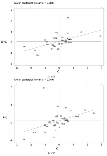 Local Moran’s I scatterplot. Notes: BJ—Beijing, TJ—Tianjin, HEB—Hebei, SXI—Shanxi, NM—Inner Mongolia, LN—Liaoning, JL—Jilin, HLJ—Heilongjiang, SH—Shanghai, JS—Jiangsu, ZJ—Zhejiang, AH—Anhui, FJ—Fujian, JX—Jiangxi, SD—Shandong, HEN—Henan, HUB—Hubei, HUN—Hunan, GD—Guangdong, GX—Guangxi, HN—Hainan, CQ—Chongqing, SC—Sichuan, GZ—Guizhou, YN—Yunnan, SNX—Shaanxi, GS—Gansu, QH—Qinghai, NX—Ningxia, XJ—Xinjiang. As space is limited, this study only shows the scatterplot chart in 2005 and 2015.
