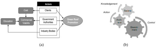 The network of interactions among key factors, affecting the promotion of green-roof: (a) model of the network by Nicole Tassicker et al.; (b) network model by Sri Yuliani et al. [29].