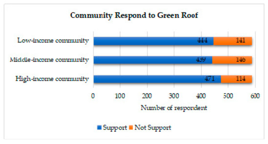 In another part of the study that compiled the results of some data, it was indicated that community responses to the existence of a green-roof tended to give support, as described in Figure 2, Figure 3, Figure 4 and Figure 5. Figure 2 presents the proportion of people who support and do not support green-roof innovation, from the community of low, middle, and high-income.