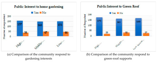 Comparison of interests in (a) gardening activities and (b) green-roof based on the economic level of the community.