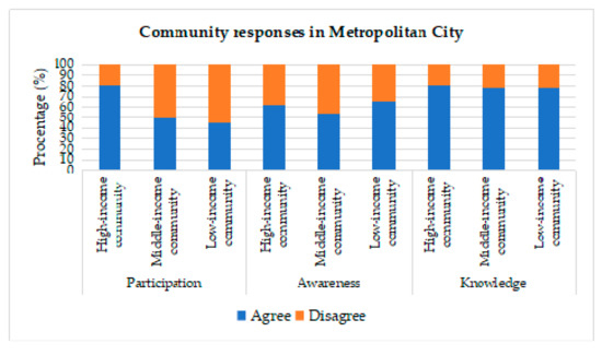 The results of the community responses based on residential location were obtained, as shown in Figure 6, Figure 7 and Figure 8. Figure 6 shows a comparison of responses of community members that resided in metropolitan areas, where the knowledge level of the importance of green-roofs relatively supported the existence of green-roof in residential buildings. People who lived in metropolitan cities in Indonesia apparently had a less supportive response to an active role in participating in the existence of green-roof. In the aspect of participation, middle and low-income people tended to disagree with the provision of green-roof for occupancy; whereas, the aspects of awareness and knowledge had high supportive responses.