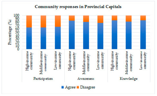 The response of people living in the provincial-capital region had a different character from the people living in metropolitan cities. In general, people from low to high-income levels provided support of more than 50%, and people who had not yet supported was more than 30%, as shown in Figure 7. Meanwhile, for the aspect of awareness and knowledge, people living in the provincial-capital region had more support than the aspect of participation.